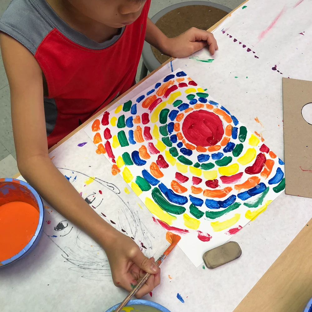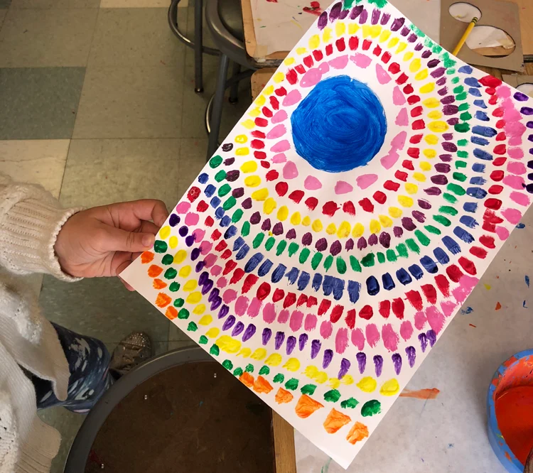 Students start by painting a quarter circle, then add a series of short, dashed strokes that “grow” outward from the curve. The fun twist is in the color: the tutorial shows students how to experiment with color mixing so one hue gradually shifts into another—like a gentle rainbow effect made from their own paint blends.