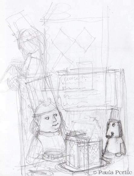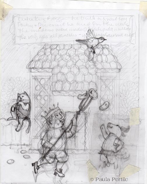 The Fine Hall is now a real building size, and everyone’s moving around. I added the cat having a wash, and the bird making off with a pancake from the roof. The dog is leaping for a pancake (like a frisbee), and the King is just a weird little guy with a fancy pitchfork, picking pancakes and bits off the Hall and flinging them around. More fun, right? (and fyi, “black puddings and white” is blood sausage (black) and pork/oatmeal sausage (white), which will be the panes of the windows).