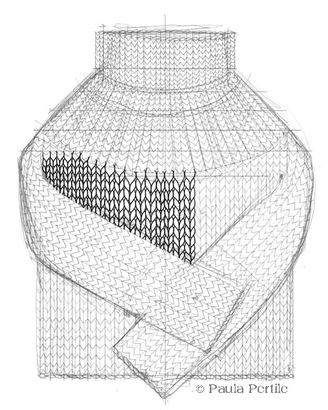 And here is a very work-in-progress Turtleneck Sweater. This shows exactly how I create these drawings. I sketch out the basic shape and design, then lay in the rows of stitches, very roughly, with “V’s” to show where each stitch goes, then I painstakingly draw each stitch with the black ‘ink’. After that’s done I’ll erase out the background guidelines, and clean everything up. There are always “overdraws” and bits that haven’t quite joined up right, that need touching up. Its very fiddly, and I have to take quite a few breaks.
