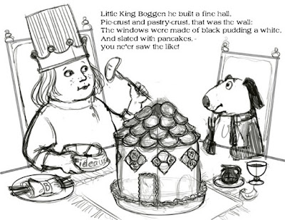 I found a couple of versions of the rhyme. One doesn’t call him “Little” King Boggen, and there are other fiddly bits in the text that are different. But I decided to go with “Little”, and make him a kid. I also toyed with the idea of making him a dog or other animal (well, it doesn’t say the king is a person, does it?), but then stuck with the kid. I did like adding the dog though, and fell in love with the idea of the King being a chef, and the “fine hall” is a table-top size creation that they then enjoy eating.