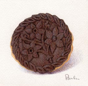 This first one is a ‘stamped’ design with chocolate on one side, some kind of creme filling, then a vanilla version of the stamped design on the reverse. I drew this on Fabriano Artistico watercolor paper, which is really textured, and sort of worked against me. But I wrangled it and got it under control and made it do what I wanted. The cookie is very dark, with the even darker impressions where its stamped. Doing a drawing where all the values are in the last 25% or so of the grey scale is rather challenging. I did resort to using some black, but mostly used dark browns, with a little greyed lavender on top to raise some highlights. This is small – about 4 inches square. But is still larger than the actual cookie!