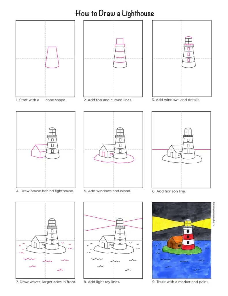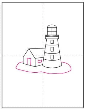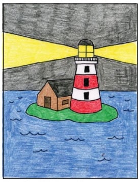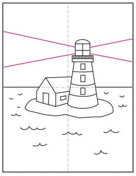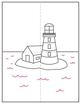 Learn how to draw a lighthouse with an easy step by step tutorial. This one is located on a tiny island, full of story-telling possibilities.