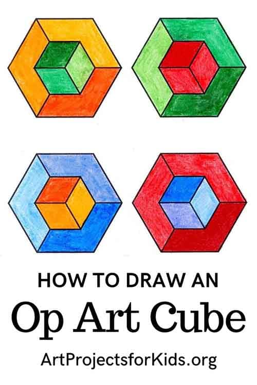 Students can learn how to draw an Op Art Cube, one of the easiest (and most satisfying!) optical illusions to create. Op art—short for optical art—is a style of visual art that uses lines, shapes, patterns, and contrast to trick the viewer’s eye into seeing movement, depth, or 3D form on a flat surface. The movement took off in the 1960s, when artists began experimenting with bold geometric designs that seemed to vibrate, shift, or pop off the page.