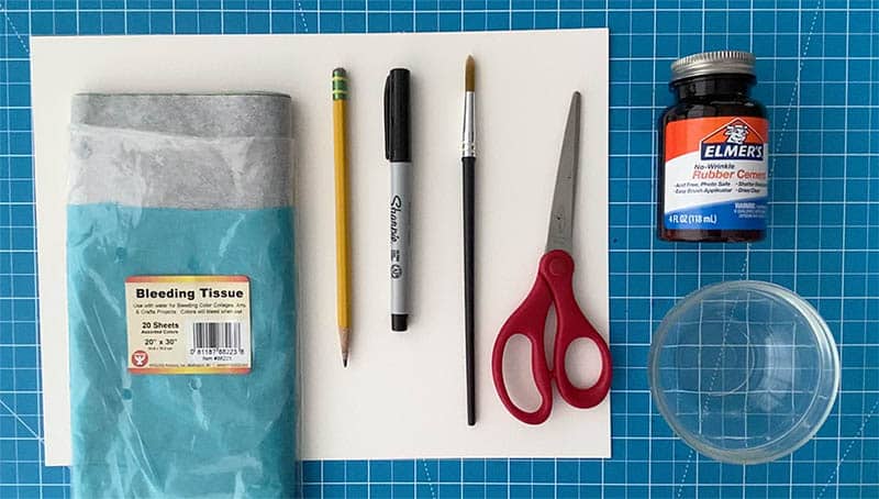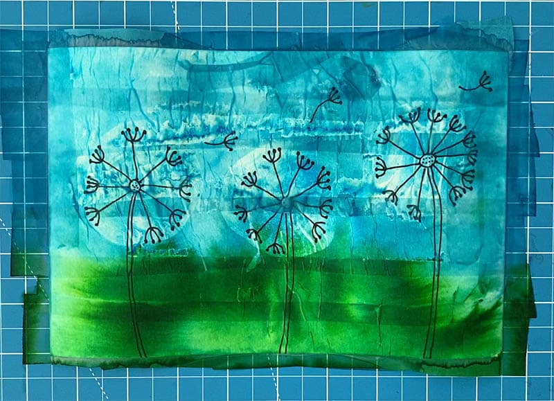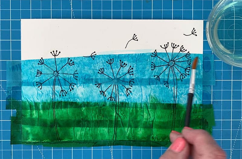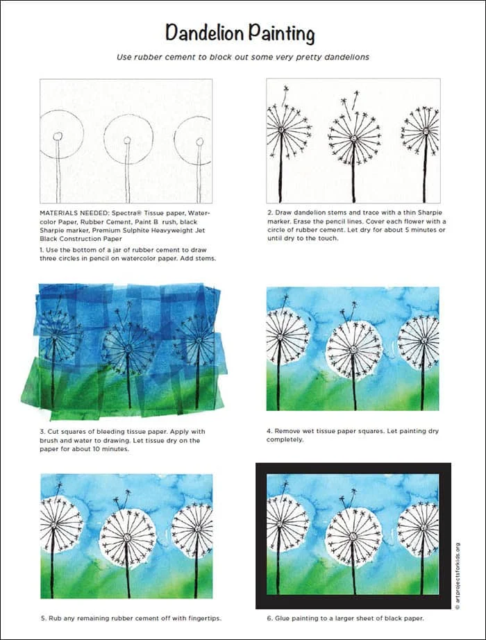 To make this simple dandelion painting, start by drawing a stem and the thin little lines of the puffball with a permanent black marker on watercolor paper. Next, use rubber cement to paint a round shape over the top of the puffball, then let it dry completely. Brush clean water over the paper, then place strips of blue and green bleeding tissue paper on the wet surface, overlapping them as you go. Brush more water on top until the tissue paper is fully saturated, then let the color transfer before removing the paper. After everything dries, gently rub off the rubber cement to reveal a bright white dandelion shape underneath.