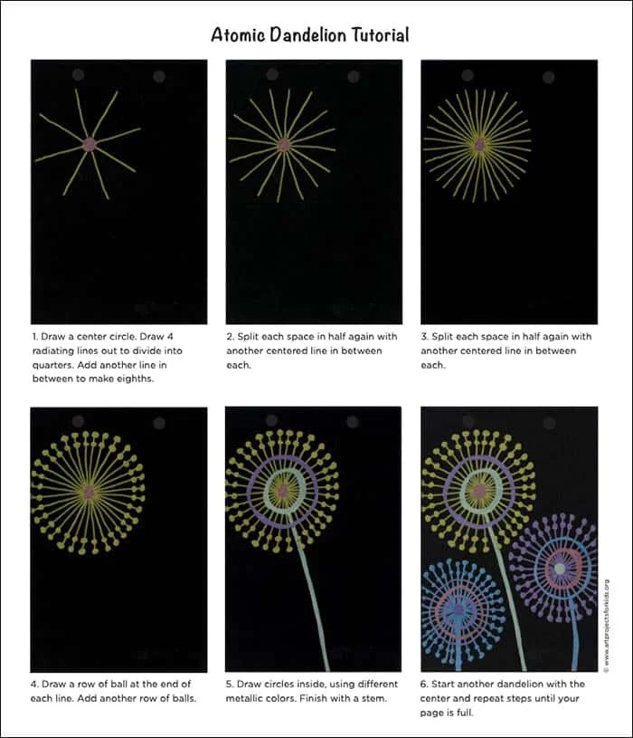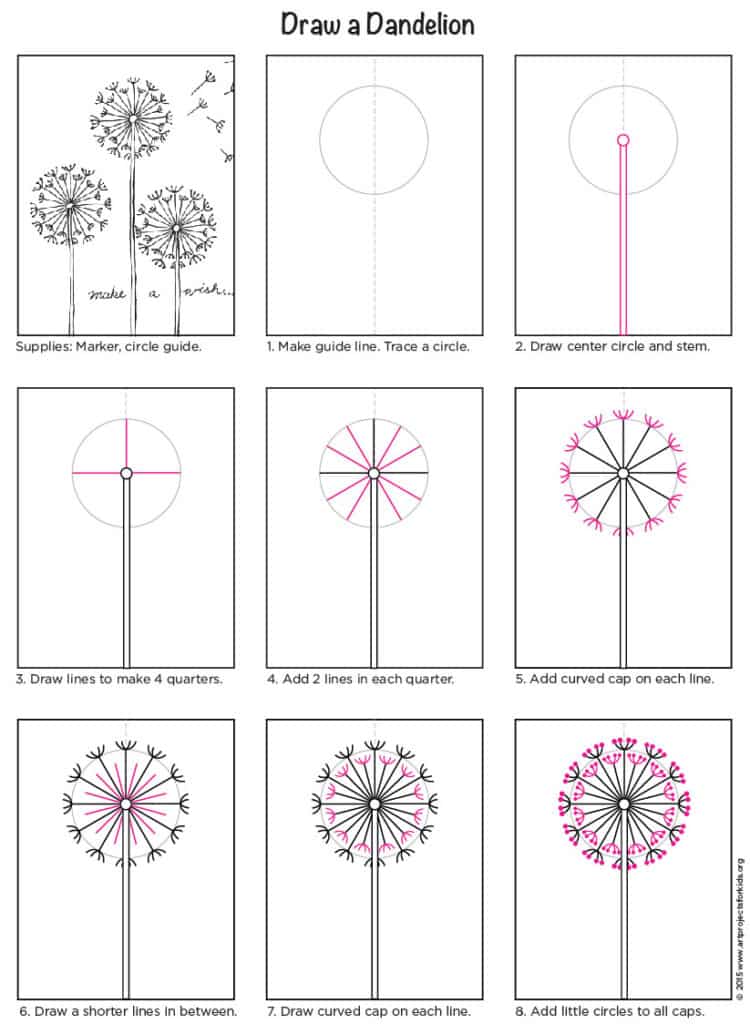 This How to Draw a Dandelion tutorial shows how striking line drawings can be, when they are kept to just a few simple shapes. A very pretty dandelion can be drawn with just a stem, round center and lots of feathery seeds.