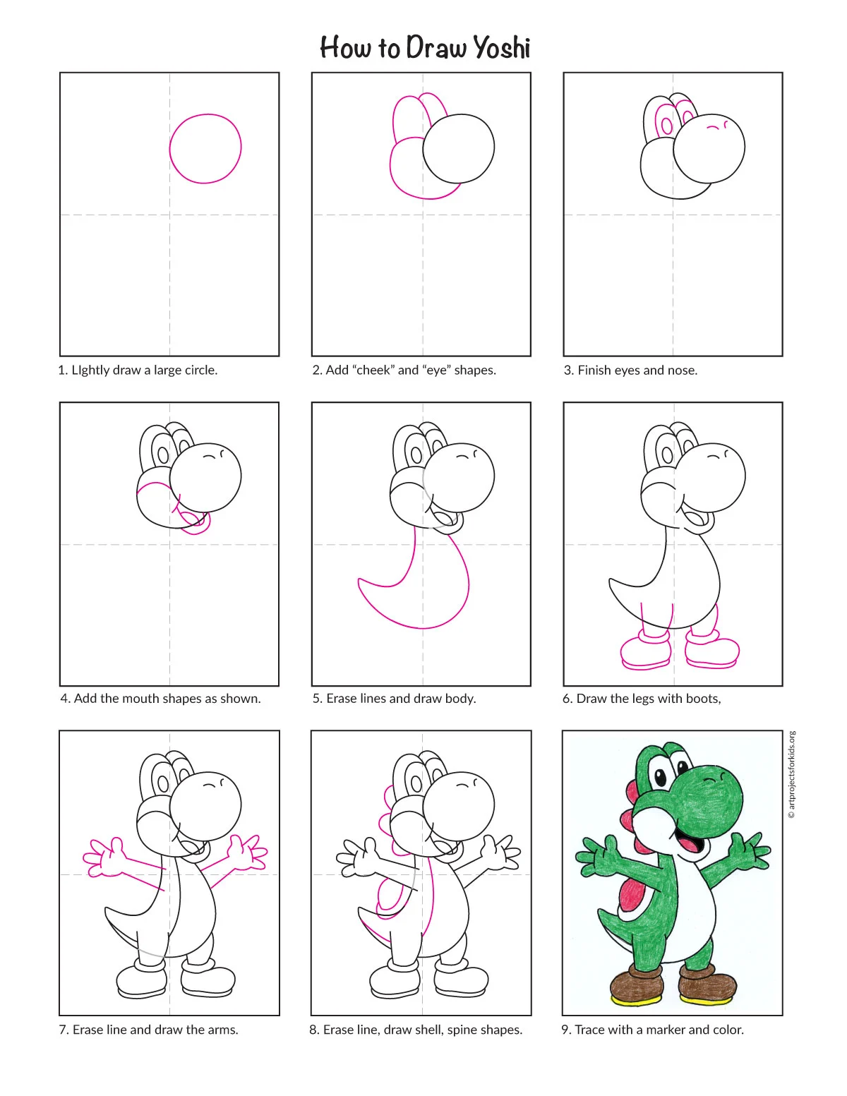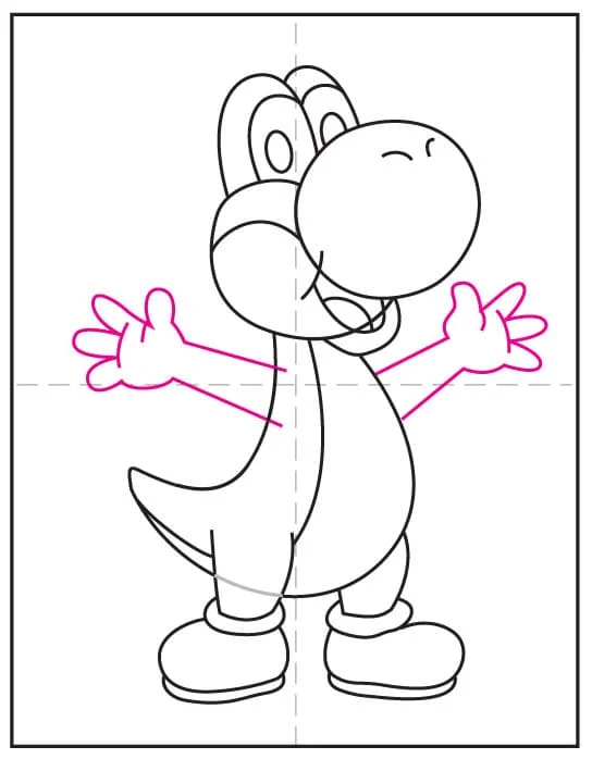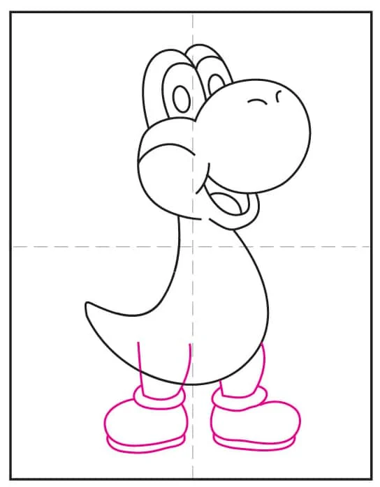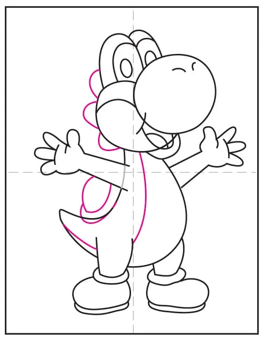 Learning how to draw Yoshi this way is ideal for a wide range of skill levels too, since struggling artists can stay with the basic shapes while more advanced artists can add extra details like shading, texture, or backgrounds.