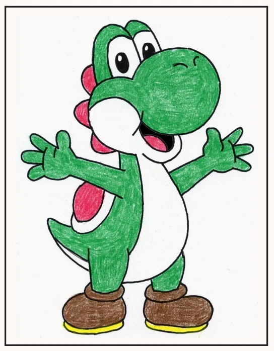Yoshi’s design also shows how shape language can make a character feel a certain way. Yoshi is made mostly of circles, ovals, and soft curves, which give him a friendly, cute, and approachable look. That makes him especially appealing for kids to draw.