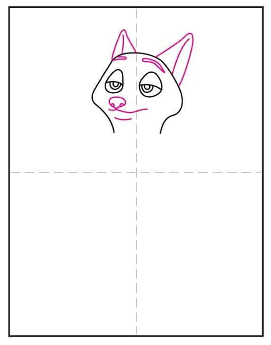 Character designers use shape language to help us understand a character’s personality before they even speak. Shapes with sharp points and angles — like triangles — often feel sneaky, clever, or a little mischievous, which fits Nick Wilde perfectly. In this drawing, Nick’s pointed ears, tapered muzzle, and slightly angled features give him that sly, confident vibe.