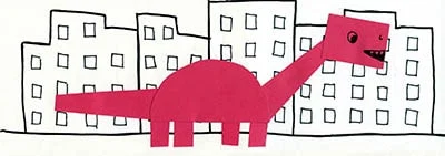 In this project, students create a lively city scene and then add a bold dinosaur collage on top. To keep things spontaneous (and to avoid the “tiny, careful, barely-there” drawings that can happen with pencil), students draw directly with a big, thick marker—no pencil lines allowed. After they finish their background, they cut a dinosaur shape from brightly colored cardstock, assemble it, and glue it down with a glue stick for an instant pop of color and texture.