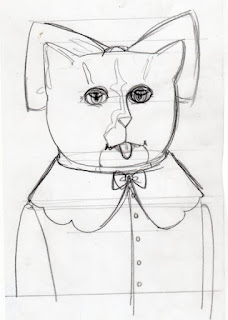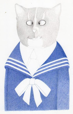Here is Edmund, about half rendered with colored pencils. He is in a traditional Edwardian juvenile sailor get-up. He will get more colored pencil and fur, then I’ll do a little Photoshop magic to make some whiskers and put in the banner with his name underneath, like all the other kitties have.